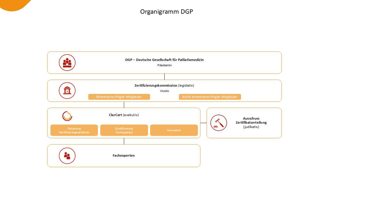 FachgesellschaftDie Deutsche Gesellschaft für Palliativmedizin (DGP) ist der Initiator und Gestalter für die Zertifizierungssysteme. Die DGP gibt die Politik und Ausrichtung für die Weiterentwicklung dieser Zertifizierungssysteme vor. Die Aufgaben der DGP liegen weiterhin in der Rechte- und Mandatsvergabe der Zertifizierungssysteme.